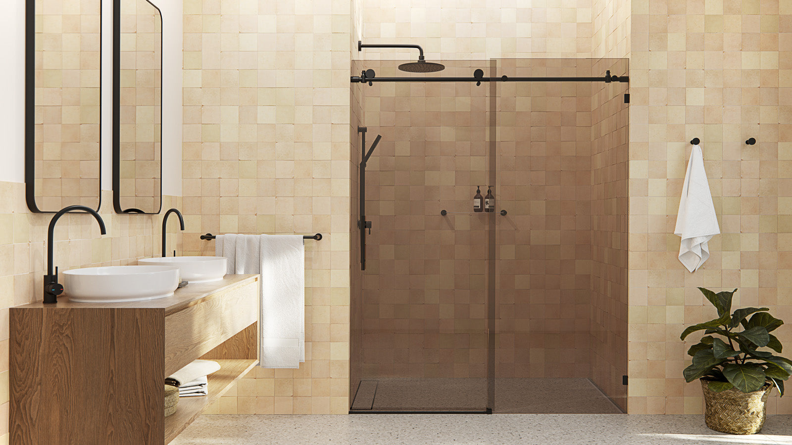 Frameless hinged shower doors that swing open for a wide, accessible entry. Built with thick tempered glass and premium hardware for a clean, modern look.