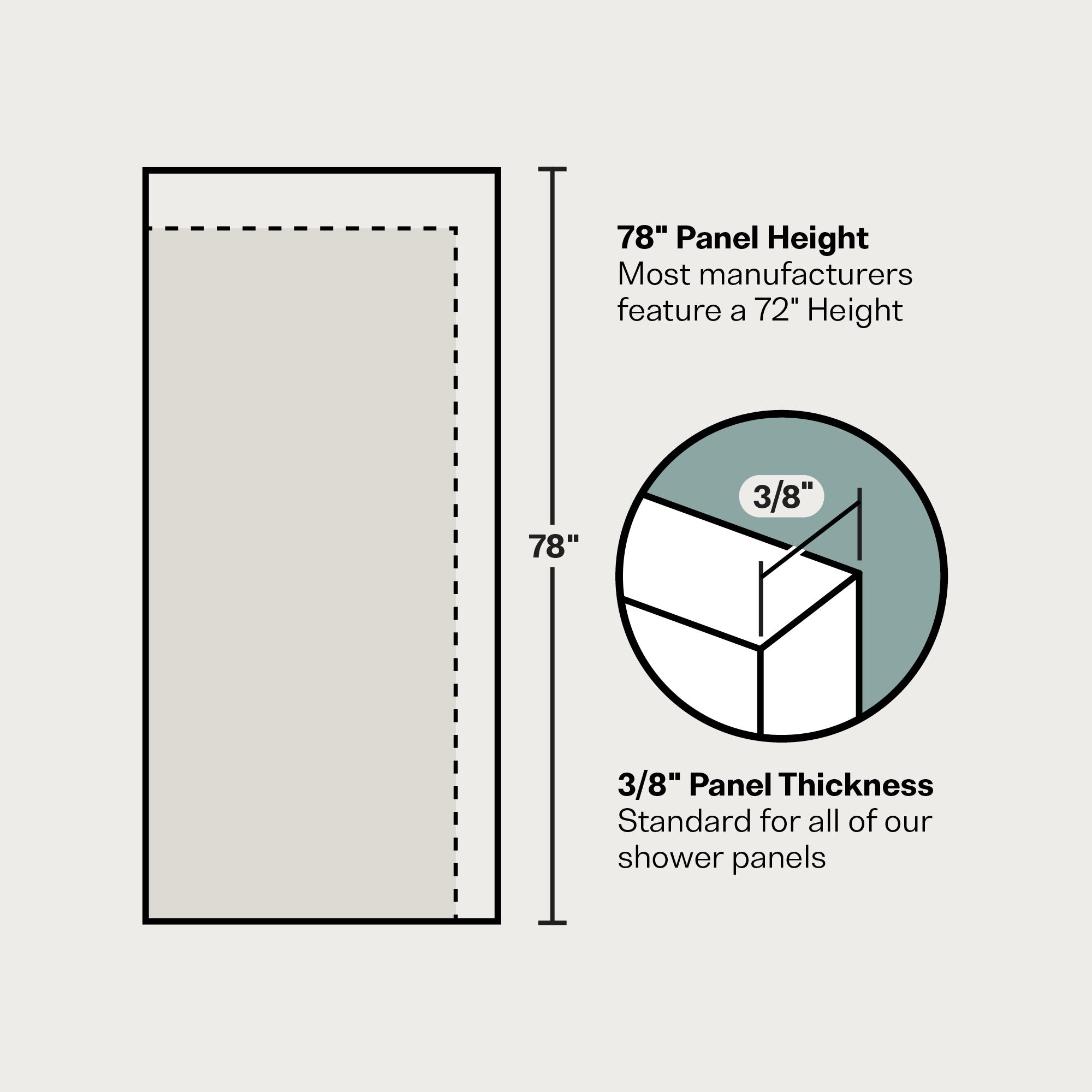Full shower models are all 78” tall, except for arch panels which are 86.75” tall. Bathtub models are typically 58.25” tall but range up to 66” depending on the model.