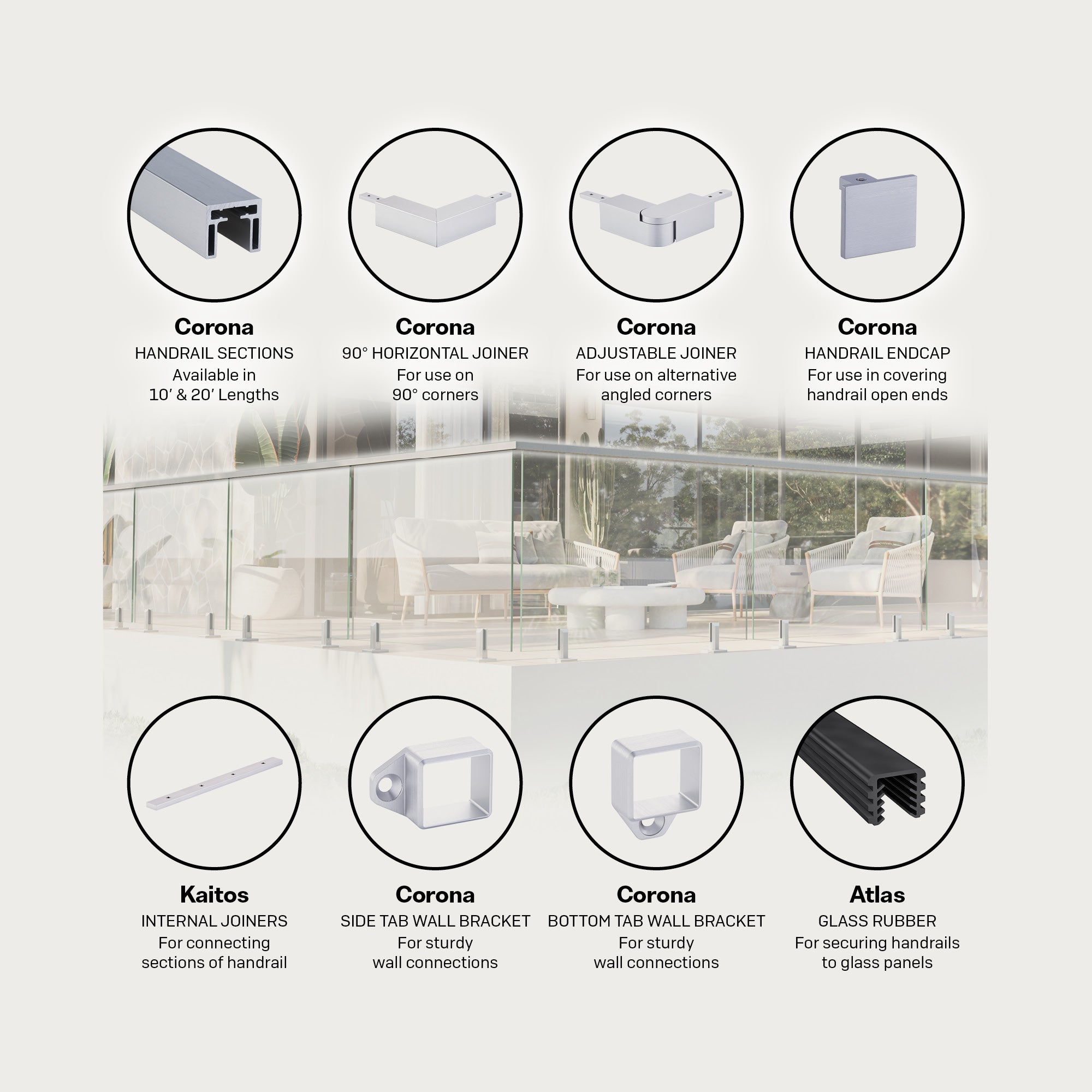 The Corona is a square, premium grade aluminum handrail system designed to work in tandem with our spigot and channel frameless glass railing systems. Its streamline design minimizes visual impact on your view line and is available in the same premium finishes to match your spigots or channels. The Corona handrail system attaches to glass panels with ease to finish your railing project with unmatched efficiency and a stylish modern aesthetic. Various joiners, wall brackets, and endcaps are also available to match your finish and style handrail.